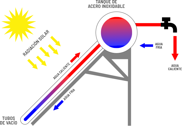 Cuando el agua fría entra en el tanque del termo solar empieza el proceso químico: por gravedad, el agua baja hasta el fondo del tubo, y por termodinámica (calentamiento), el agua se pone menos densa y sube sola.